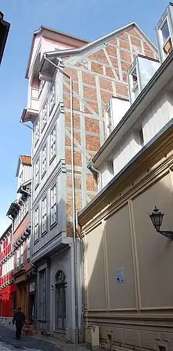 Das östliche, viergeschossige Vorderhaus ist jüngeren Entstehungsdatums und stammt aus dem Jahr 1711.[2] Das Erdgeschoss ist in massiver Bauweise errichtet. Es verfügt über ein Korbbogenportal in dessen Scheitel sich ein Wappen befindet. In der Mitte des 19. Jahrhunderts entstand der im neogotischen Stil erstellte Laden. Die oberen Geschosse sind in Fachwerkbauweise gefertigt. Die Gefache sind mit Zierausmauerungen versehen. Darüber hinaus bestehen Profilbohlen. Im Gebäudeinneren befindet sich eine Treppe aus der Zeit des Barock.