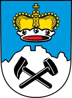 Blasonierung: „Geteilt durch den Umriss des Silberbergs in Blau und Silber; oben der goldene Kurhut mit silbernem Hermelinbesatz, unten gekreuzt ein schwarzer Schlägel und ein schwarzer Bergmannshammer.“[24] |
