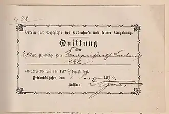 Mit der Vereinsgründung begann der Aufbau einer öffentlich zugänglichen Sammlung von Altertümern aus dem Bodenseeraum sowie von Literatur über den Bodensee. 1912 erfolgte mit Unterstützung der Stadt Friedrichshafen und des Grafen Ferdinand von Zeppelin die Erneuerung und Wiedereröffnung als modernes „Bodensee-Museum“.[8] Der Erste Weltkrieg und seine Folgen machten eine Weiterentwicklung des Museums unmöglich; deshalb ging es zum 12. Januar 1927 in die Trägerschaft der Stadt Friedrichshafen über. Das Museum verbrannte bei der Zerstörung Friedrichshafens am 28. April 1944.[9] Die in den Palast Hohenems evakuierte Vereinsbibliothek wurde nach dem Krieg weitergeführt und 1971 der Stadt Friedrichshafen übergeben, die sie als Bodenseebibliothek (mit gegenwärtig rund 36000 Medien) unterhält.[10] Diese Medien können vor Ort eingesehen oder ferngeliehen werden. Der Zugriff darauf erfolgt über den Katalog des Südwestdeutschen Bibliotheksverbundes Baden-Württemberg, Saarland, Sachsen.[11]