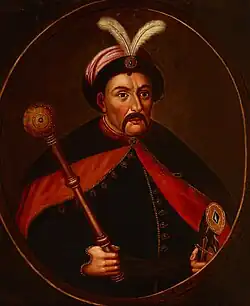 Bohdan Mychajlowytsch Chmelnyzkyj (ukrainisch Богдан Миха́йлович Хмельницький, wiss. Transliteration: Bohdan Mychajlovyč Chmel'nyc'kyj; * 1595 vermutlich in Subotiw bei Tschyhyryn (möglicherweise auch in Schowkwa); † 6. August 1657 in Tschyhyryn) war ein Hetman der Saporoger Kosaken und der Gründer des protostaatlichen Kosaken-Hetmanats. Er war der Anführer des großflächigen Chmelnyzkyj-Aufstands gegen die Herrschaft Polen-Litauens und treibende Kraft hinter dem Vertrag von Perejaslaw, der sein Gemeinwesen unter den Schutz des Zarentums Russland stellte. Zu seinen Ehren wurde 1888 das Bohdan-Chmelnyzkyj-Denkmal in Kiew enthüllt[1]. Er gilt in der Ukraine als Nationalheld und wird auch in Russland verehrt. Sein Wirken ist aber auch kontrovers wegen der vielfachen Gewalt gegen Juden, die sein Aufstand auslöste.