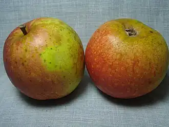 Die Frucht besitzt deutlich sichtbare Kelchblätter in einer flachen bis mitteltiefen Kelchhöhle. Der Stiel ist kurz bis mäßig lang, teils verdickt und sitzt in einer nicht besonders tiefen aber engen Stielhöhle, die im unteren Bereich meist etwas berostet ist.[1][3]