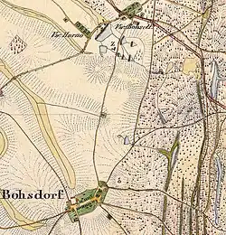 1844 ist Bohsdorf als Dorf mit einem Vorwerk, zwei Wassermühlen, einer Windmühle und einer Ziegelei beschrieben. Im Ort und im Vorwerk standen 54 Wohnhäuser mit 322 Einwohnern.[21] Im Urmesstischblatt 4352 Döbern von 1845 ist die Ziegelei südlich des Vorwerks eingezeichnet, die beiden Wassermühlen waren ebenfalls in der Nähe des Vorwerks. Die Windmühle stand am östlich Ortsausgang.