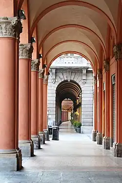 Bekannt ist Bologna außerdem für seine Arkaden. Sie erstrecken sich über 38 km und wurden ursprünglich geschaffen, um der wachsenden Bevölkerung der Stadt gerecht zu werden. Der Bau der Arkaden ermöglichte es, die oberen Stockwerke auszubauen und so neuen Wohnraum zu schaffen, ohne den Handel und den Durchgangsbetrieb zu stark zu beeinträchtigen. Die Wallfahrtskirche Santuario della Madonna di San Luca liegt auf dem Guardiahügel oberhalb der Stadt und bietet einen Blick über die Poebene. Zur Kirche hinauf führt der mit rund vier Kilometern längste Arkadengang der Welt. Die Arkadengänge von Bologna sind seit Juli 2021 UNESCO-Welterbe.[14]