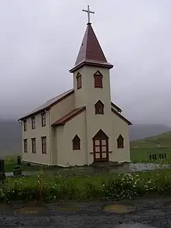 Die helle, wellblechgedeckte Kirche Hólskirkja von 1908 befindet sich oberhalb des Ortes auf dem Gehöft Hóll, „Hügel“.[11] Ihre Kanzel befindet sich genau über dem Altar. Die Kirche war bis 1925 im Privatbesitz der Bauern von Hóll, bis sie im gleichen Jahr von der Lutherischen Staatskirche gekauft wurde. Ausgemalt wurde die Kirche 1978. Die Hólskirkja besitzt zwei alte Glocken, die 1620 und 1775 gegossen wurden.