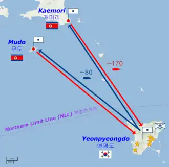Nach nordkoreanischer Darstellung dagegen kam es am 23. November 2010 erstmals gegen 13 Uhr Ortszeit zu Artillerieangriffen der südkoreanischen Streitkräfte über nordkoreanischem Gewässer nahe der Yeonpyeong-Insel, worauf Nordkorea umgehend mit einem Angriff auf die Insel reagierte.[8][9] Nach offizieller nordkoreanischer Darstellung war der Angriff eine Reaktion auf „südkoreanische Schüsse in Richtung nordkoreanischer Hoheitsgewässer“.[10]