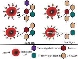 Die Ursache für das Fehlen der Vorläufersubstanz H ist ein Gendefekt, beispielsweise beim Leukozytenadhäsionsdefekt Typ II. Unabhängig vom Erbgang des AB0-Typs reagiert der Bombay-Typ weder mit A- noch B-Antikörpern (phänotypisch Blutgruppe 0). Er reagiert dagegen mit Blutgruppe 0 (phänotypisch Anti-0), weil die Vorläufersubstanz H in jedem Träger von AB0 vorkommt und beim Bombay-Typ ganz früh im Leben Antikörper gegen die Vorläufersubstanz gebildet wurden. Somit kommt für die Betroffenen nur eine Eigenblutspende oder Spenderblut von Menschen desselben Gendefekts in Frage.[4]