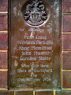 Guildford Bombing Memorial in Quaker's Acre. Die Inschrift lautet: Zum Gedenken an Paul Craig, William Forsyth, Anne Hamilton, John Hunter und Caroline Slater. Ermordet am 5. Oktober 1974.