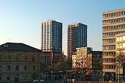 | Die Bonifazius-Türme in Mainz, hier mit einem Werbebanner zum 100-jährigen Jubiläum des FSV Mainz 05 | ||