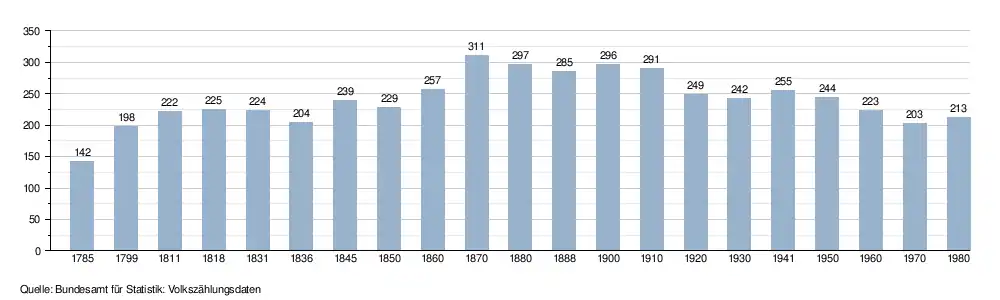 - ↑ a b Daten der Eidgenössischen Volkszählungen ab 1850 nach Gemeinden. (XLSX; 10 MB) Bundesamt für Statistik, Neuchâtel, 12. Juli 2024, abgerufen am 19. September 2025 (Öffnung in Excel nur über "Anhang/Excel-Datensatz" möglich).