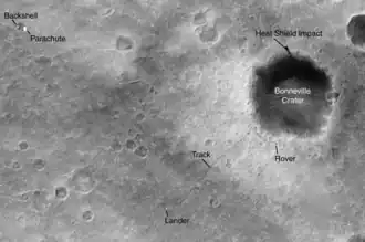 Der Rover fotografierte auf der ihm gegenüberliegenden Seite Bonnevilles den Hitzeschild, den die Landesonde nach ihrem Eintritt in die Marsatmosphäre absprengte. Das helle weiß-blaue Leuchten des Schildes stach in der ansonsten komplett orange-roten Umgebung besonders hervor.