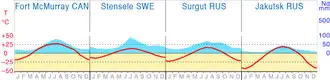 | Ø-Temperaturen | Kältester Monat: unter 0 bis unter −40 °C Jahresmittel: unter −8 bis über 0 °C Wärmster Monat: über 5 bis 20 °C |