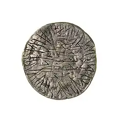 • Revers: k=rist=us (b)i | bius=ank=uis fifiþ | fit=am itirn=a|m k=ustotaþit (= Christus … das gnädige Blut lebt, möge es das ewige Leben bewahren).