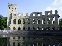 Zum Schluss wurde der Ruinenberg als Landschaftspark gestaltet, und 1845 baute Ferdinand von Arnim nach Entwürfen von Ludwig Persius einen Wartturm im normannischen Stil. Seine Hauptaufgabe war es, Aussichten zu ermöglichen. Auch das Bornimer Amtsgehöft war zu sehen. Diese Sichtachse ist jetzt durch ein Technologiezentrum verbaut. Der Turm war zugleich Zielpunkt der neubepflanzten Chaussee von Bornim und des Bornstedter Kirchenschiffs. Der Weg von Bornstedt nach Nedlitz (heute Kirschallee) wurde 1842 von Lenné auf der Ostseite mit einer Hecke und eine Lindenreihe bepflanzt.