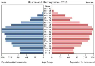 Bosnien und Herzegowina hatte 2022 3,2 Millionen Einwohner.[14] Die Einwohnerzahl sank um 1,2 %. Zum Bevölkerungsrückgang trug ein Sterbeüberschuss (Geburtenziffer: 8,3 pro 1000 Einwohner[15] vs. Sterbeziffer: 15,9 pro 1000 Einwohner[16]) bei. Die Bevölkerung sinkt seit den 1990er-Jahren infolge des Krieges, aufgrund von Auswanderung und wegen der niedrigen Geburtenrate. Die Anzahl der Geburten pro Frau lag 2022 statistisch bei 1,3, die der Region Europa und Zentralasien betrug 1,7.[17] Der Median des Alters der Bevölkerung lag im Jahr 2021 bei 41,8 Jahren.[18] Im Jahr 2023 waren 14,7 Prozent der Bevölkerung unter 15 Jahre,[19] während der Anteil der über 64-Jährigen 18,7 Prozent der Bevölkerung betrug.[20]