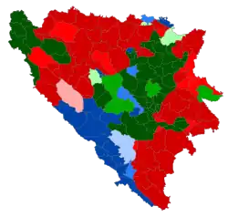 Die Volkszählung 2013 ergab einen Anteil von 50,1 Prozent Bosniaken (größtenteils Muslime), 30,8 Prozent Serben (größtenteils Orthodoxe) sowie 15,4 Prozent Kroaten (größtenteils Katholiken).[23] Der Rest der Bevölkerung gehört entweder einer der 17 offiziell anerkannten Minderheiten wie Roma und Juden an[24] oder gab keine ethnische Zuordnung an. Die ethnische Selbstzuordnung der Bosnier basiert hauptsächlich auf ihrer Religionszugehörigkeit und der teils damit verbundenen kulturellen Unterschiede. Eine sprachliche Trennung gibt es innerhalb Bosniens nicht, da alle Volksgruppen ijekavisch-neuštokavische Dialekte des Serbokroatischen sprechen. Seit den Jugoslawienkriegen bezeichnen sie ihre Sprache jedoch in der Regel analog zur ethnischen Zugehörigkeit als Bosnisch, Kroatisch oder Serbisch und verwenden den entsprechenden schriftsprachlichen Standard.