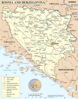 Bosnien und Herzegowina (bosnisch/kroatisch/serbisch-lateinisch Bosna i Hercegovina [], serbisch-kyrillisch Босна и Херцеговина, Abkürzungen: BiH/БиХ; auch Bosnien-Herzegowina oder verkürzt Bosnien genannt) ist ein südosteuropäischer Bundesstaat. Er besteht geografisch aus der Region Bosnien im Norden – die rund 80 Prozent des Staatsgebietes einnimmt – und der kleineren Region Herzegowina im Süden. Politische Teilgebiete des Bundesstaates sind die Föderation Bosnien und Herzegowina, die Republika Srpska sowie der Brčko-Distrikt als Sonderverwaltungsgebiet. Hauptstadt und zugleich größte Stadt des Staates ist Sarajevo. Weitere Großstädte sind Banja Luka, Tuzla, Zenica, Bijeljina und Mostar.