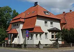 Das vielgliedrig und kleinteilig aufgebaute Gebäude entstand im Jahr 1909. Bedingt durch seine Ecklage verfügt das Haus über zwei Fassadenseiten, die jedoch auf Verzierungen verzichten.