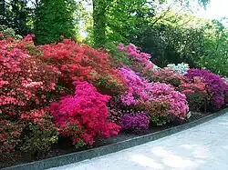 Ahornallee, Rhododendren, Magnolien und Kapelle