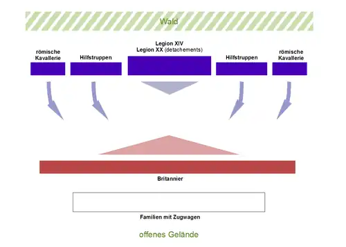 Suetonius Paulinus standen etwa 10.000 Mann – bestehend aus der Legio XIIII Gemina, Vexillationen der Legio XX Valeria Victrix sowie Auxiliartruppen – zur Verfügung. Von der Legio II Augusta in Exeter unter dem Praefectus castrorum Poenius Postumus hatte Suetonius keine Unterstützung erhalten, da dieser sich weigerte, sich mit Suetonius’ Streitkräften zu verbinden. Suetonius Paulinus wählte laut Tacitus als Kampfplatz eine durch eine Schlucht begrenzte Ebene mit Wald im Hintergrund, so dass er die Feinde auf einer offenen Ebene vor sich hatte und keinen Hinterhalt befürchten musste. Die Legionssoldaten wurden in dichten Reihen aufgestellt, auf beiden Seiten die Hilfstruppen und auf den äußersten Flügeln die Reiterei. Tacitus schreibt, dass die Britannier in ungeordneten Haufen umherliefen. Außerdem, so behauptet Tacitus, hätten sie voller Siegeszuversicht ihre Frauen mitgebracht, die auf Wagen am äußersten Rand der Ebene saßen.[28]
