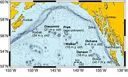 - ↑ a b Seamounts in the Eastern Gulf of Alaska: A Volcanic Hotspot with a Twist? National Oceanic and Atmospheric Administration, 12. Juli 2005, abgerufen am 27. Oktober 2008 (englisch).