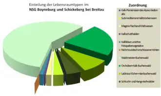 - Magere Flachland-Mähwiesen unterhalb der Waldzonen mit Streuobstbeständen und Vorkommen des Wiesen-Fuchsschwanzes und des Großen Wiesenknopfes[10]