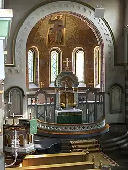 Einige der Ausstattungsgegenstände stammen aus der Vorgängerkirche aus dem 12. Jahrhundert. Im Gang befinden sich viele Grabstätten.