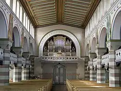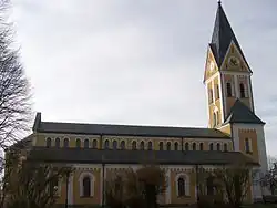 Die Kirche ist eine gemauerte dreischiffige Basilika. Sie verfügt über einen Kirchturm mit Uhr und einem Rundbogenportal. Das Mittelschiff verfügt auf jeder Seite über 21 Obergaden. Die beiden Seitenschiffe weisen große Rundbogenfenster auf.