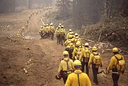 Im Westen der Vereinigten Staaten wurde im Jahr 1988 eine vergleichsweise große Anzahl an Bränden registriert. Im Laufe des Jahres wurden über 72.000 Brände gemeldet, von denen rund 300 als schwer eingestuft wurden.[51] Die Mitarbeiter der Feuerwehr und deren Ausrüstung wurden bis zum Äußersten beansprucht; zusätzlich halfen über 11.700 Angehörige des US-Militärs bei den Löscharbeiten im Yellowstone-Nationalpark.[52] Zum Höhepunkt der Brände waren mehr als 9.600 Feuerwehrleute und Hilfskräfte gleichzeitig im Park im Einsatz, insgesamt nahmen 25.000 Menschen an den Löscharbeiten teil.[52] Normalerweise arbeiteten die Mannschaften zwei bis drei Wochen, wurden nach Hause geschickt und kehrten dann für ein oder zwei weitere Einsätze zurück. Ein normaler Arbeitstag dauerte bis zu 14 Stunden.[47] Zu den Aufgaben gehörten das Ausheben von Brandschneisen, der Schutz von Gebäuden, das Entfernen von Unterholz in der Nähe von Bauwerken und die Installation von Wasserpumpen. Hunderte Feuerwehrleute wurden den Maschinenbesatzungen zugeteilt, da ein Großteil der Löscharbeiten auf den Gebäudeschutz ausgerichtet war. Im Park selbst starben keine Feuerwehrleute durch die Brände, ein Feuerwehrmann und ein Flugzeugpilot kamen jedoch bei einzelnen Vorfällen außerhalb des Parks ums Leben.[40] Mehrere Feuerwehrleute wurden wegen verschiedener Verletzungen behandelt, wobei Müdigkeit, Kopfschmerzen und Rauchvergiftungen zu den häufigsten Behandlungsursachen zählten. Einige Feuerwehrleute wurden giftigen Dämpfen durch Schwefelemissionen aus einem Geothermalgebiet ausgesetzt.[40]