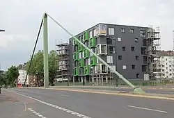 Die Schrägseilbrücke hat ein 26,4 m breites Brückendeck aus einer orthotropen Platte und einem Stahl-Hohlkasten mit weiten Auskragungen. Anstelle konventioneller Pylone hat sie zwei senkrechte stählerne Stiele auf der Mittellinie der Brücke, die mit dem Brückendeck biegesteif verbunden sind, es um 16,5 m überragen und an ihrer Spitze einen Kabelsattel für die Schrägseile tragen. Das somit an insgesamt nur zwei über diese Stiele geführten Seilen aufgehängte Brückendeck wurde beim Bau auf der Straße hergestellt und abschnittsweise eingeschoben.