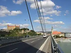 Die Brücke des Slowakischen Nationalaufstandes in Bratislava (slowakisch offiziell Most SNP,[1] kurz für Most Slovenského národného povstania, ab 1993 bis 29. August 2012 offiziell Nový most – Neue Brücke; in August 2012 wurde sie wieder in Most SNP zurück umbenannt[3]) ist eine zwischen 1967 und 1972 nach einem Entwurf von Arpád Tesár (Bauingenieur), Jan Lacko (Architekt) und Ivan Slameň (Architekt) errichtete Straßenbrücke über die Donau, die den Namen nach dem Slowakischen Nationalaufstand 1944 trägt. Sie ist die bekannteste der sechs Donaubrücken in der Stadt und verbindet den Stadtteil Petržalka mit der Altstadt (Staré Mesto) von Bratislava.