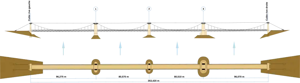 Die Straßenbrücke hat zwei Fahrspuren und einen Gehweg an beiden Seiten. Sie ist von Ankerblock zu Ankerblock gemessen 453 Meter lang und hat einen Pfeilerachsabstand zwischen den äußeren Pylonen von 353,42 Meter. Die Aufteilung der Brücke in einzelne Spannfelder wurde durch die Fahrrinne des Loire-Seitenkanals und ihren Deich im Flussbett bestimmt. Der Achsabstand vom Pfeiler am rechten Ufer bis zum Pfeiler Nr. 3 auf dem Deich betrug 96,07 Meter. Aus Gründen der Symmetrie erhielt das Spannfeld am linken Ufer eine mit 96,27 Meter fast gleiche Länge. Der in der Mitte verbleibende Abschnitt wurde danach in zwei 80,57 Meter bzw. 80,51 Meter lange Spannfelder aufgeteilt.