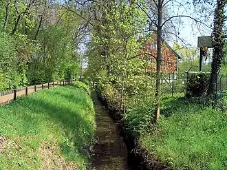 Brückenbach am Unterlauf in Groß Stöckheim, Blickrichtung ist Fließrichtung, links liegt das Teichgelände. | ||
