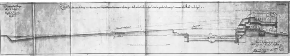Vor der Escarpe des Brückenkopfes liegt ein breiter, wassergefüllter Graben. Hinter der Escarpe befindet sich eine durchgehende Galerie mit zahlreichen Scharten für die infanteristische Verteidigung. Dem Bauwerk waren mehrere Wassergräben und ein ausgedehntes Glacis vorgelagert.