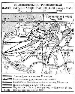 Beginnend im November 1943 wurden die Truppen im Brückenkopf heimlich durch Teile der sowjetischen 2. Stoßarmee im Umfang von etwa 44.000 Mann, 600 Geschützen und weiterem Material verstärkt. Am 14. Januar 1944 brach sie im Rahmen der „Krasnoje Selo-Ropschaer Operation“ (Teil der Leningrad-Nowgoroder Operation) aus dem Brückenkopf aus, unterstützt von der Artillerie aus Kronstadt und Schiffen der Baltischen Flotte. Die deutsche Wehrmacht wurde zurückgeworfen und die Leningrader Blockade durchbrochen. Die sowjetischen Truppen stießen weit nach Süden und Westen vor.