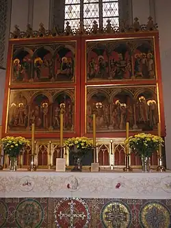 Das Chorgestühl entstand Ende des 14. Jahrhunderts. Dessen Rückwände wurden um 1600 von dem Rheinländer Reinhard Roggen mit 42 Bildern katholischer und evangelischer Theologen versehen, darunter Luther, Melanchthon und Bugenhagen.