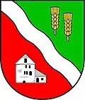 Blasonierung: „Von Grün und Rot geteilt durch einen schrägrechten Wellenbalken; oben zwei goldene Ähren; unten ein silberner Turm mit schwarzen Fenster und Türöffnungen, dem links ein silbernes Nebengebäude mit je einer schwarzen Tür und Fensteröffnung angelehnt ist.“