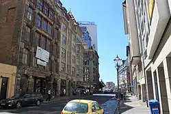 Der nordwestliche Teil der Straße ist durch das komplexe Einkaufszentrum Höfe am Brühl geprägt. Auf einer Fläche von etwa 22.300 Quadratmetern sind eine Handelsfläche von etwa 45.000 Quadratmetern mit 130 Geschäften, 70 Wohnungen und bis zu 820 Parkplätzen untergebracht.[64] Im Februar 2009 bekundete der Investor des Einkaufszentrums seinen Willen, das Projekt zu verwirklichen, nachdem er sein Finanzierungsangebot zum 200-Millionen-Euro-Bauvorhaben zuvor zurückgezogen hatte.[65]