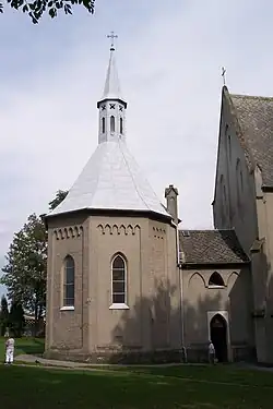 Eine erste Kapelle an der Stelle der heutigen Kirche wurde 1749 auf Initiative des Vikars Gregor Janas errichtet. Hier befand sich eine Quelle mit eiskaltem Wasser mit heilender Wirkung. Die Feldkapelle bestand aus Holz, überdeckte die Quelle und hatte einen kleinen Turm ohne Glocken und fasste bis zu 200 Personen. Der Bau wurde mit Beiträgen und der Unterstützung der ansässigen Bürger und anderen Wohltätern realisiert. Um die Kapelle wurden Pappeln gepflanzt.