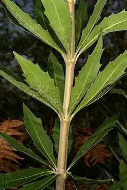 Die meist zu sechst (zu viert bis neunt) sternförmig in Wirteln an den Zweigen angeordneten Laubblätter sind in Blattstiel und -spreite gegliedert. Der Blattstiel ist bis zu 1,5 Zentimeter lang. Die einfachen Blattspreiten sind ledrig und lanzettlich bis verkehrt-eilanzettlich und meist spitz oder bespitzt.[8] Junge Blätter sind rostig-braun bis rostig-golden behaart. Ältere Blattspreiten sind dunkel- bis gelblich-grün und bis zu 15 Zentimeter lang; sie sind meist kahl und die Fiedernervatur ist deutlich erkennbar. Die Blattbasis ist keilförmig bis spitz. Der Blattrand ist unregelmäßig entfernt, grob spitzig gezähnt.[1][6][7] Oft sind Domatien vorhanden. Es sind keine Nebenblätter vorhanden.[6]