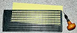 Zwischen die beiden Tafeln wird ein geeignetes Blatt Papier eingelegt und mit einem Metallstift werden nun die erforderlichen Punkte in das Papier „gestochen“.