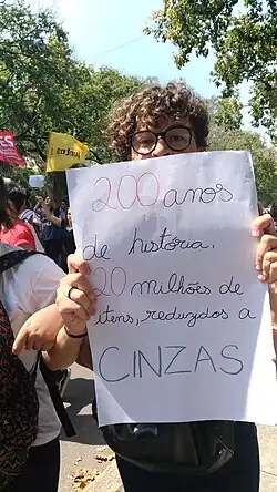 Die Nachricht über das Feuer verbreitete sich schnell in der Stadt Rio de Janeiro, und in den frühen Morgenstunden des Montagmorgens tauchten Demonstranten vor den Toren auf. Erste Berichte deuteten darauf hin, dass 500 Menschen eine Kette um das noch rauchende Gebäude bildeten.[34] Einige der Demonstranten versuchten, über die Umzäunung in das Museumsgelände zu klettern. Die Polizei, die in voller Kampfausrüstung aufmarschierte, warf daraufhin Tränengasbomben in die Menge. Die Öffentlichkeit durfte jedoch später das Gelände betreten.[35]