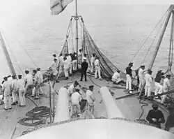 Neben den zur Beleuchtung des Schiffsinneren verbauten 575 Glühlampen waren die zwei, ab Ende der 1910er Jahre drei Scheinwerfer die größten elektrischen Verbraucher an Bord der Schiffe.[57] Die Suchscheinwerfer mit einer Leistung von jeweils rund 10 kW und 90 cm Spiegeldurchmesser waren anfangs auf Plattformen am unteren Teil der Masten platziert, blendeten dort aber die Schiffsführung. Daher wurden sie auf die Marse der Gefechtsmasten verlegt.[58] Die 20,15 m langen Gefechtsmasten dienten einerseits als Ausguck und Plattform für Revolverkanonen. Andererseits waren an ihnen die optischen und später telegraphischen Signalmittel sowie die Ladebäume der Beiboote und für die Kohlenübernahme befestigt.[59]
