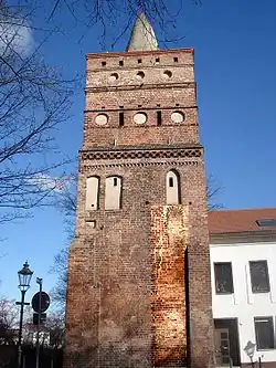 - das Neue Tor der Neustadt vor dem südöstlichen Brückenkopf der Langen Brücke über die Havel mit dem Ehebrechertorturm,