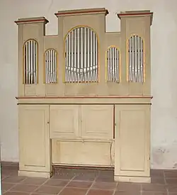 Die Kabinettorgel hat 5 Register ohne Pedal, die Windzufuhr erfolgt über einen Fußhebel.