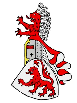 Geviert; 1 und 4 wie Stammwappen, 2 und 3 gespalten, rechts bzw. links in Silber ein einwärts gekehrter roter Löwe, links bzw. rechts blau ohne Bild. Zwei Helme mit rot-silbernen Decken; der rechte wie Stammhelm, auf dem linken ein hoher rot-gestulpter und gold-gekrönter silberner Hut, beseitet von zwei auswärts gekehrten roten Löwenklauen und mit sechs schwarzen Hahnenfedern bestückt.