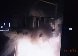 Die Brandprüfung läuft. Man beobachtet nicht nur die Brennkammertemperatur, sondern auch die Temperatur auf dem Schott und auf den Durchbrüchen selbst. Man horcht auch auf akustische Signale, wie z. B. das Knistern von heißen Kabelmänteln, welche bei Feuerentfachung die gesamte Prüfung zum Scheitern bringen können. -