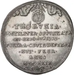 Die Stadt Thorn (Toruń) der Region Westpreußen im heutigen Polen ließ den silbernen Gedenktaler von 1629 auf die Verteidigung der Stadt Thorn als breiten Taler im Durchmesser von 46 mm und im Gewicht von 28,71 g prägen. Die Münzstätte ist Thorn (Toruń).[4]