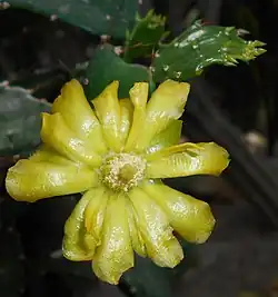 Die gelben Blüten erscheinen nahe der Spitze oder endständig an den dünnfleischigen Segmenten oder aus dem Perikarpell alter Blüten, öffnen sich am Tag und sind bis zu 6 Zentimeter lang. Zwischen der Blütenhülle und den Staubblättern befinden sich haarähnliche Staminodien.