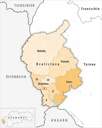 - 1949–1960: Bratislavský kraj (Bratislavaer Bezirk – mit dem heutigen nicht zu verwechseln), Tschechoslowakei