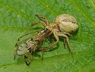 Braune Krabbenspinne (Xysticus cristatus), Weibchen mit erbeuteter Skorpionsfliege | ||||||||||||